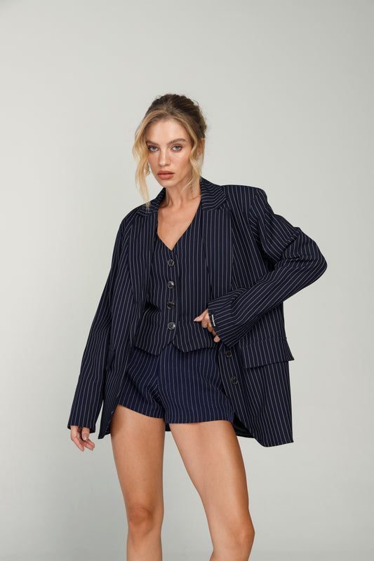 Blazer de Alfaiataria Risca de Giz Azul Marinho “La Parisienne”