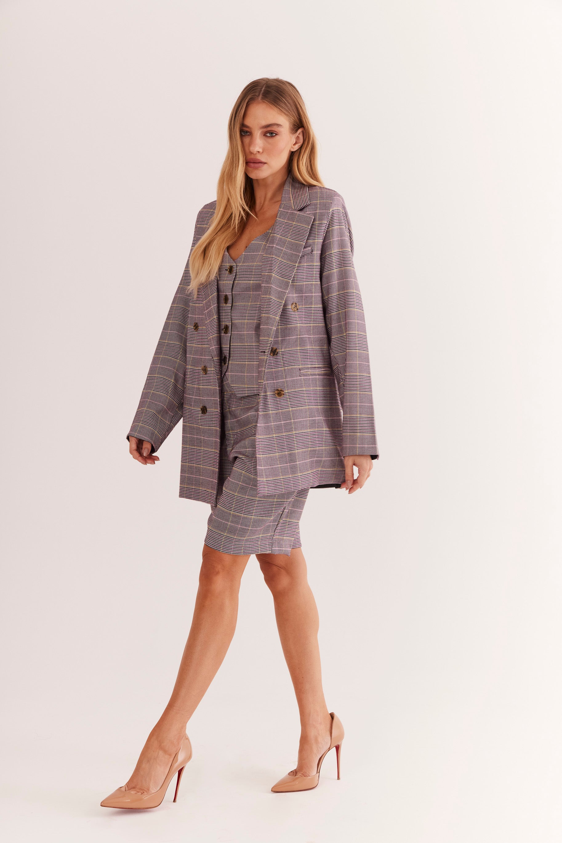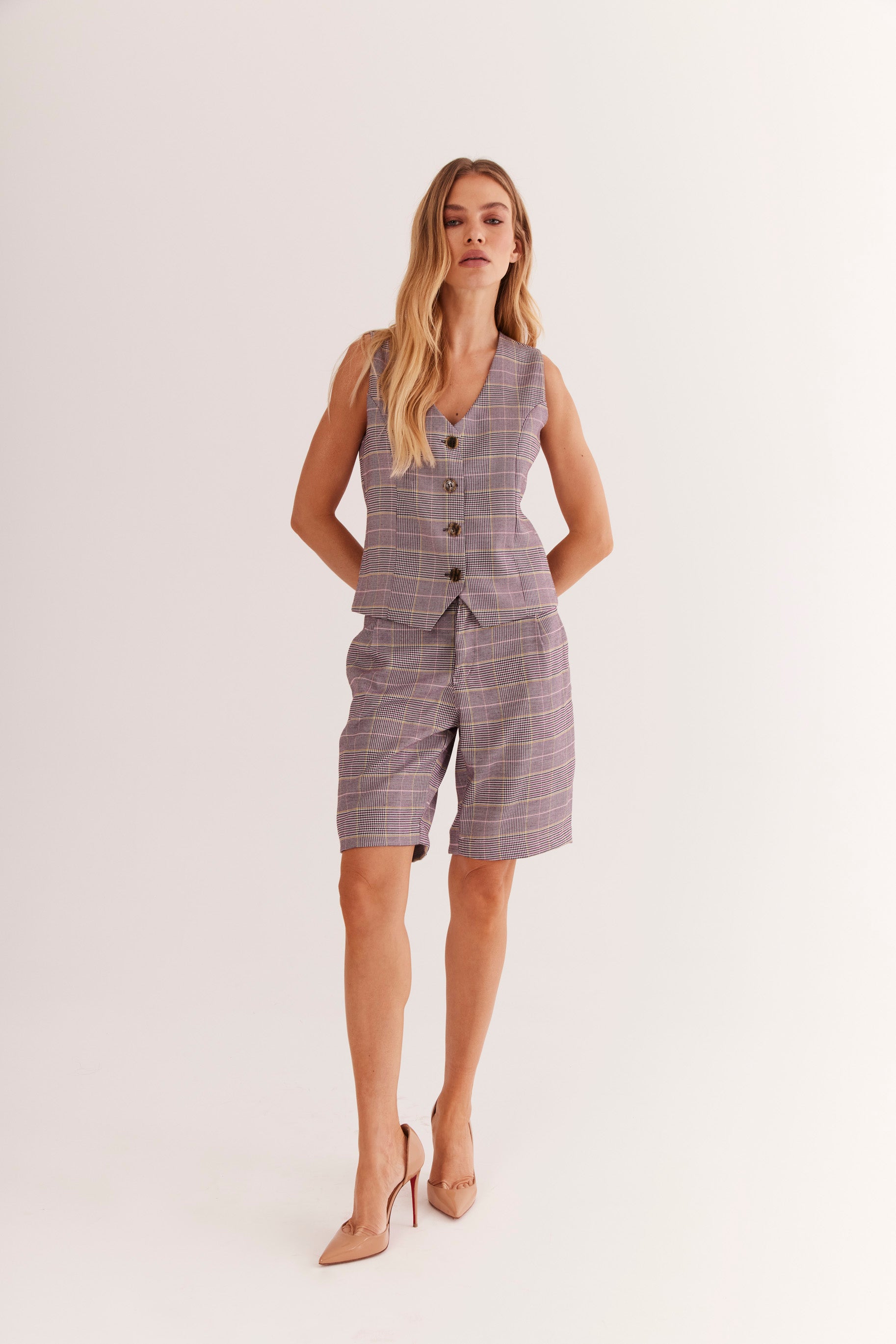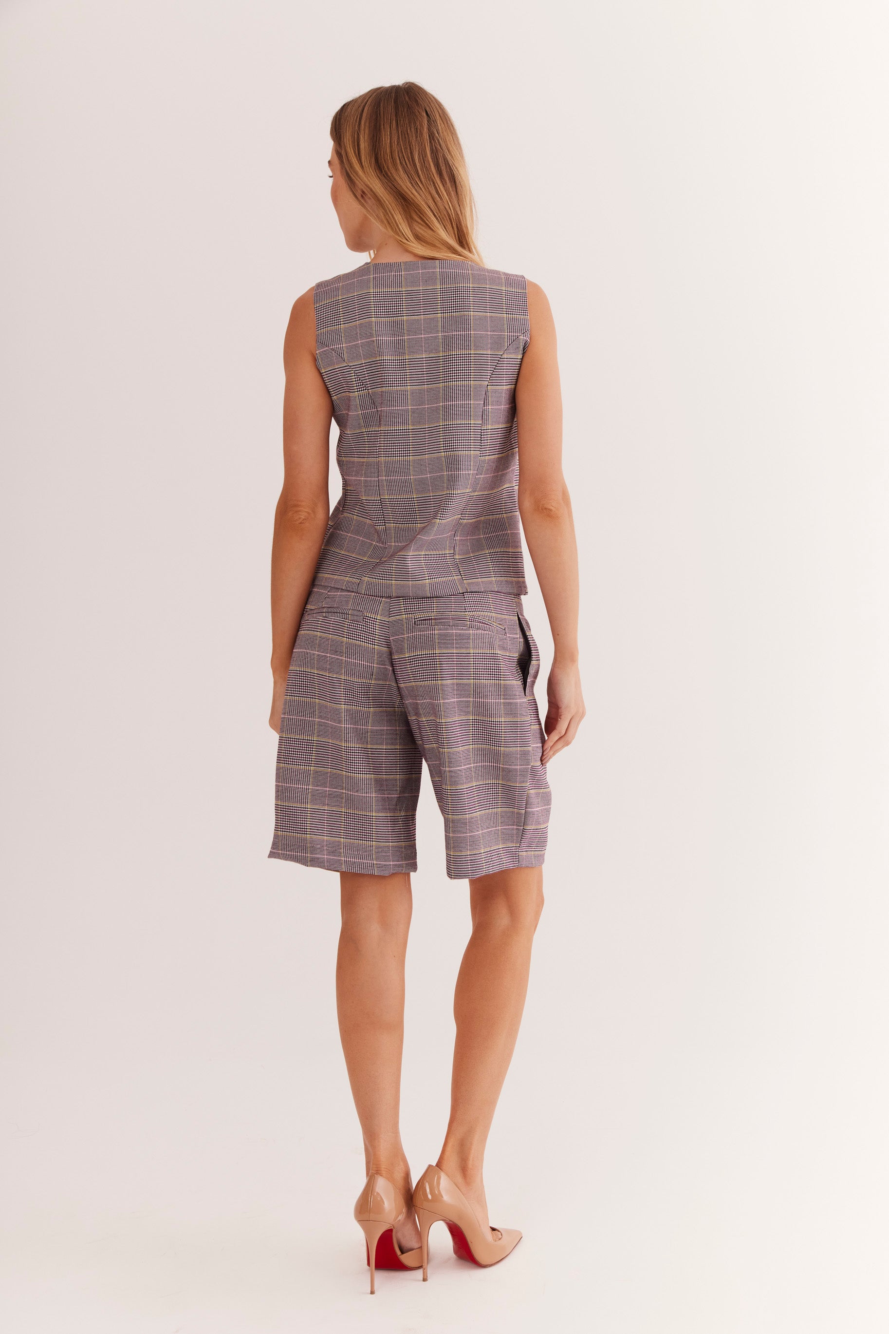 A Bermuda AMÉTHYSTE possui comprimento sofisticado, bolsos frontais funcionais, bolsos traseiros em debrum, e fechamento por zíper e colchete — traduzindo elegância atual e versatilidade.