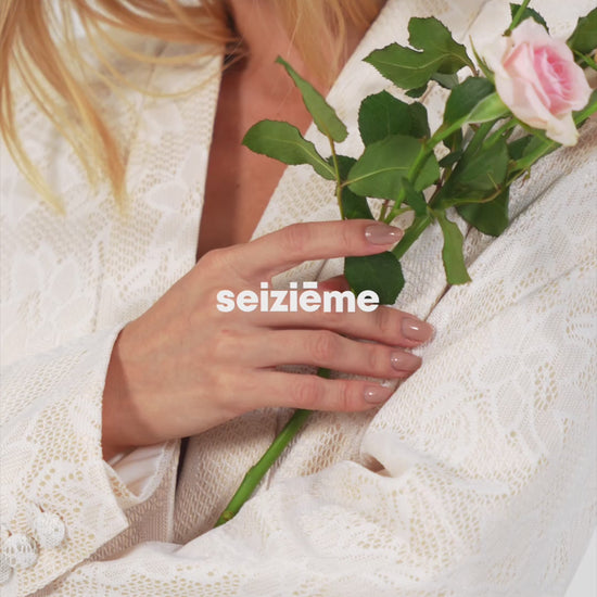 Confeccionado em um tecido dublado, que combina renda floral em alto-relevo — produzida com filamentos de poliamida e fios de algodão — sobre uma base acetinada em tom champagne creme, de brilho sutil e textura sedosa.