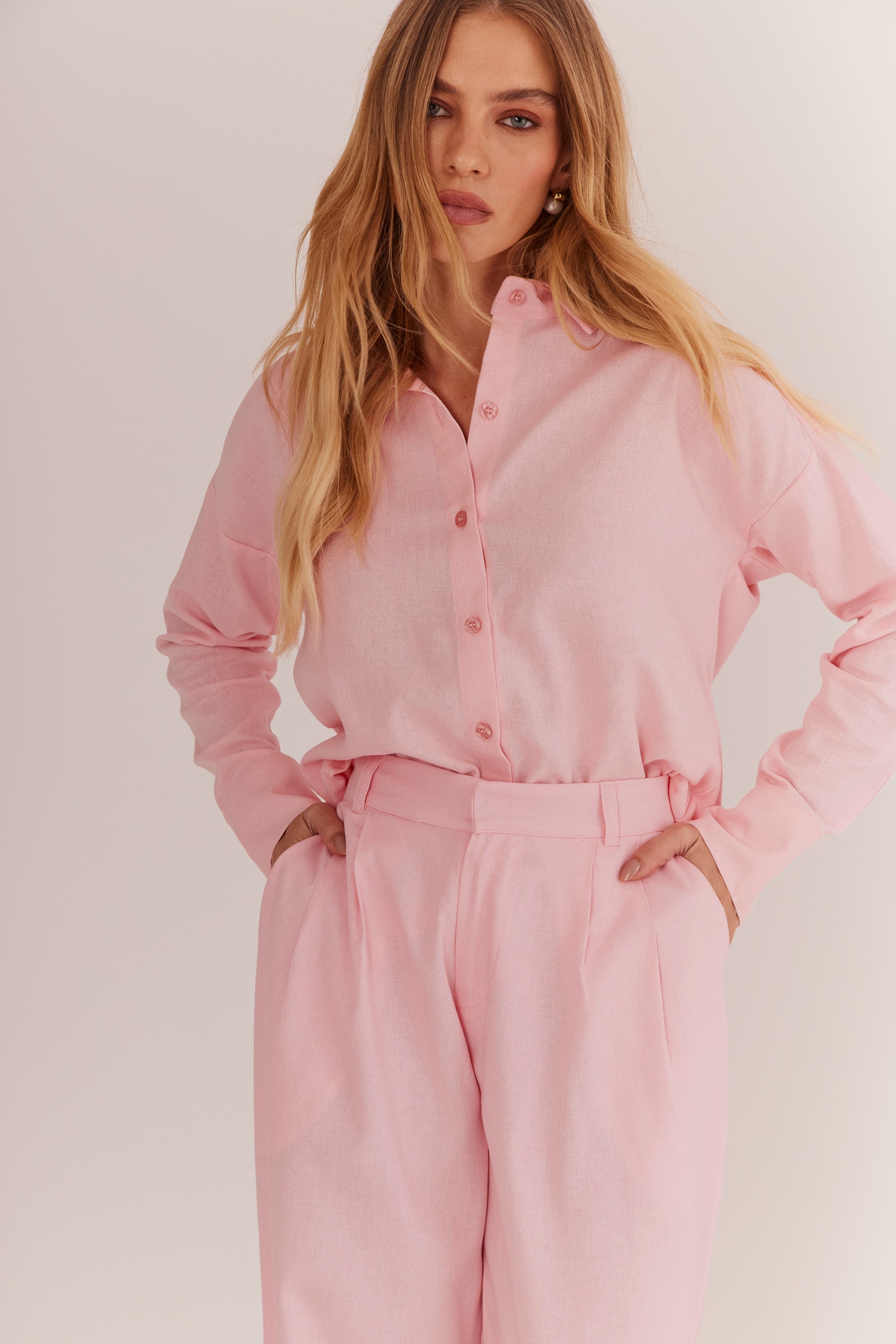 O modelo apresenta duas pences frontais, passantes para cinto e fechamento por zíper e colchete de gancho, garantindo acabamento limpo e refinado. O tom rosa Soft Milkshake adiciona um toque delicado e contemporâneo — perfeito para produções monocromáticas com a camisa da mesma família ou combinações neutras que realçam sua sofisticação.