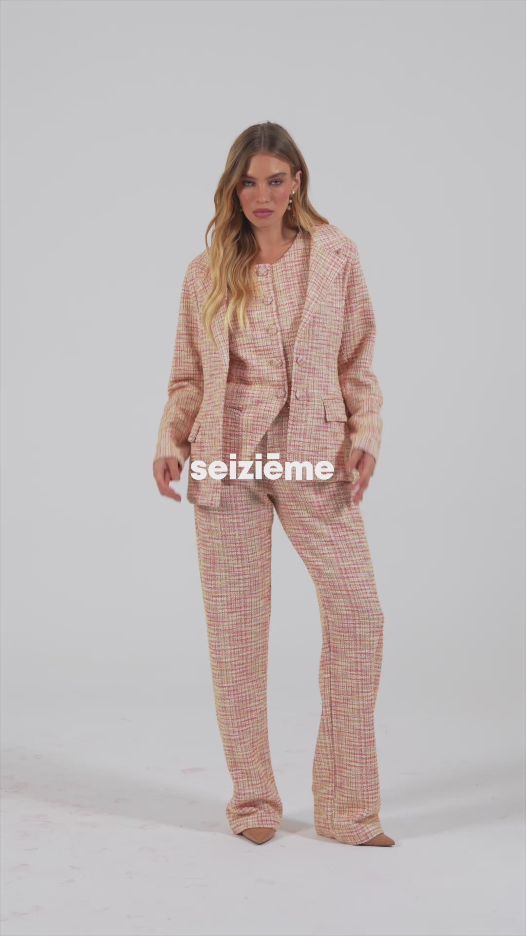 Seu tweed exclusivo mistura delicadamente tons de rosé bebê, blush, pêssego, amarelo-dourado e linhas sutis em laranja suave, criando uma paleta quente e radiante — como um horizonte cor-de-rosa iluminado pelo sol.