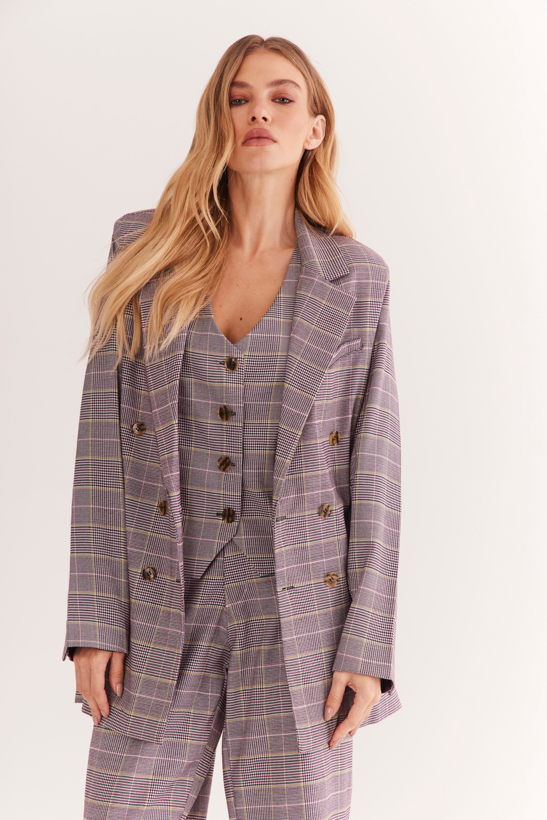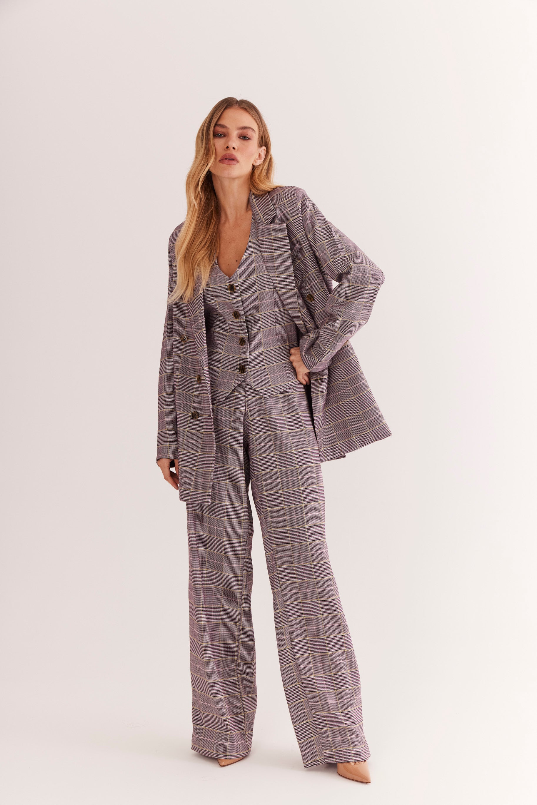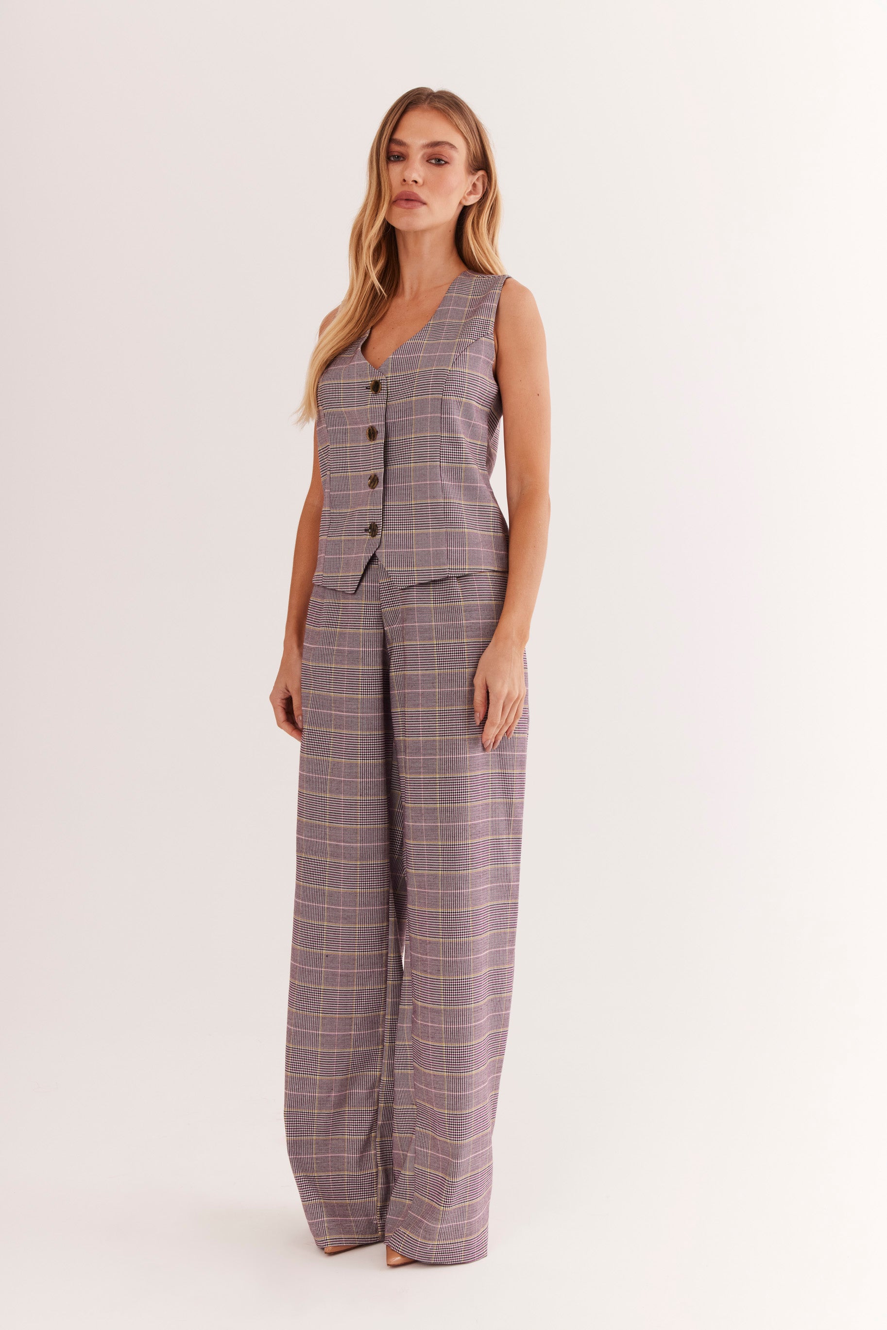O Colete AMÉTHYSTE possui decote V profundo, botões personalizados 16ème e modelagem levemente acinturada que valoriza a silhueta com sofisticação.